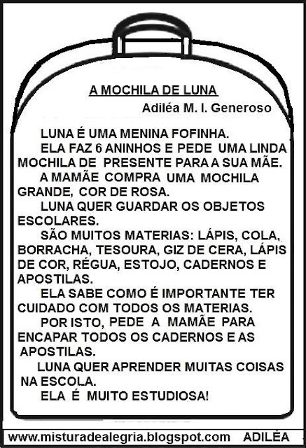 A leitura e interpretação de texto fala sobre uma menina chamada Luna, que faz aniversário e pede para a mamãe, uma mochila de presente.